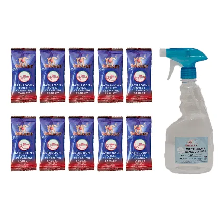 Keep your bathrooms spotless, fresh, and hygienic with the Wicket Bathroom & Toilet Cleaning Tablet Kit. This value pack of 10 effervescent tablets is designed to tackle dirt, hard water stains, lime scale, and unpleasant odors across all bathroom surfaces — from toilet bowls to tiles, bathtubs, and sinks.